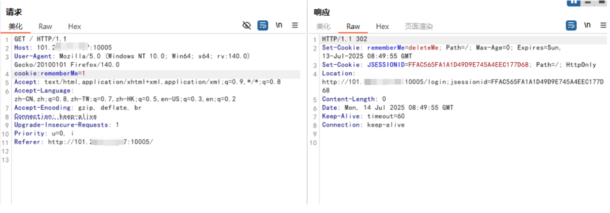 如果以上没有返回remembeMe字段还可以尝试在请求包中的cookie中加入 rememberMe=1 ,来查看返回包是否有rememberMe=deleteMe字段。如果cookie字段有值则先清空