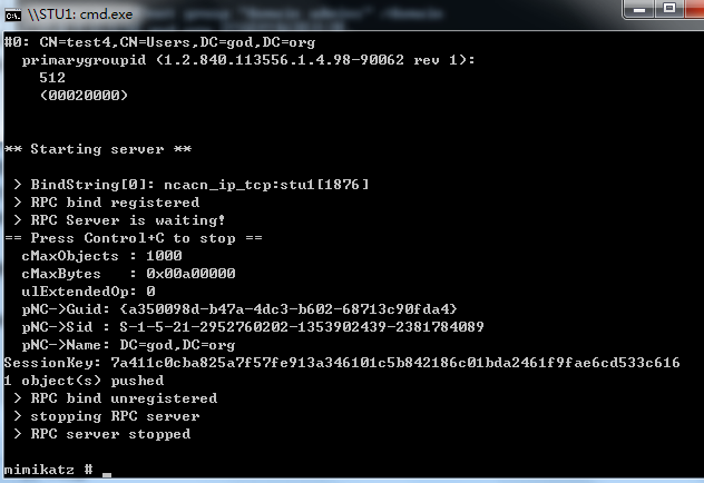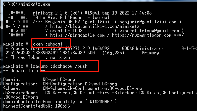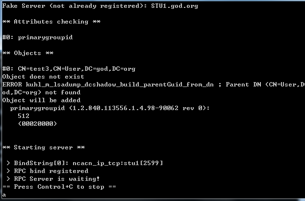 使用mimikatz执行如下的命令进行数据的更改监听,修改用户test4的primarygroupid的值为512,即将其添加到Domain Admins组中,结果如图所示: