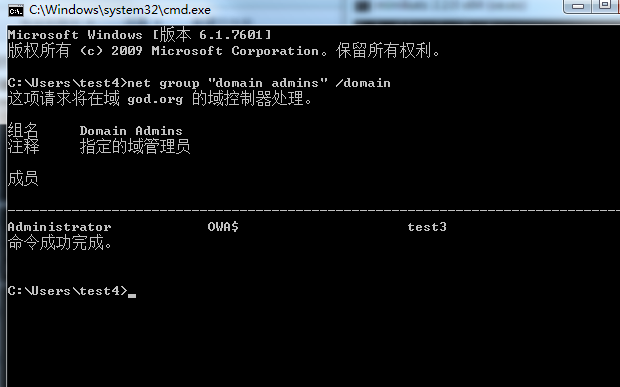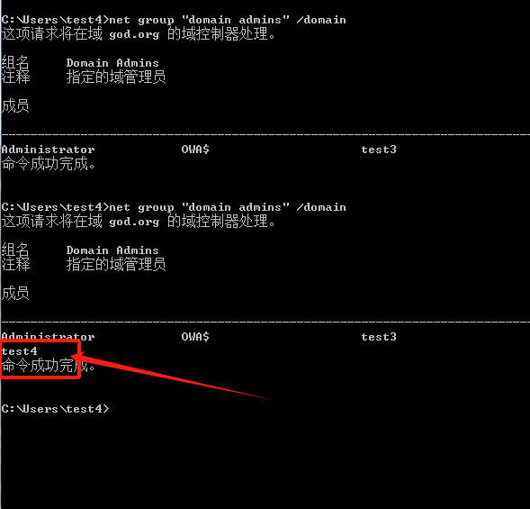 域内主机上已经登录一个普通域用户god\test4,其具有本地管理员权限。以本地管理员权限打开1个cmd窗口,还有用本地用户打开一个cmd窗口。