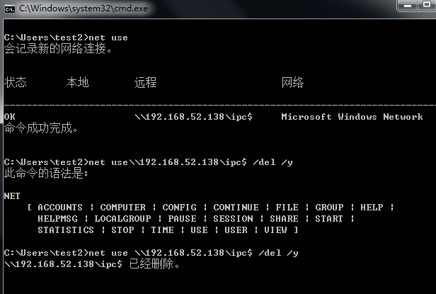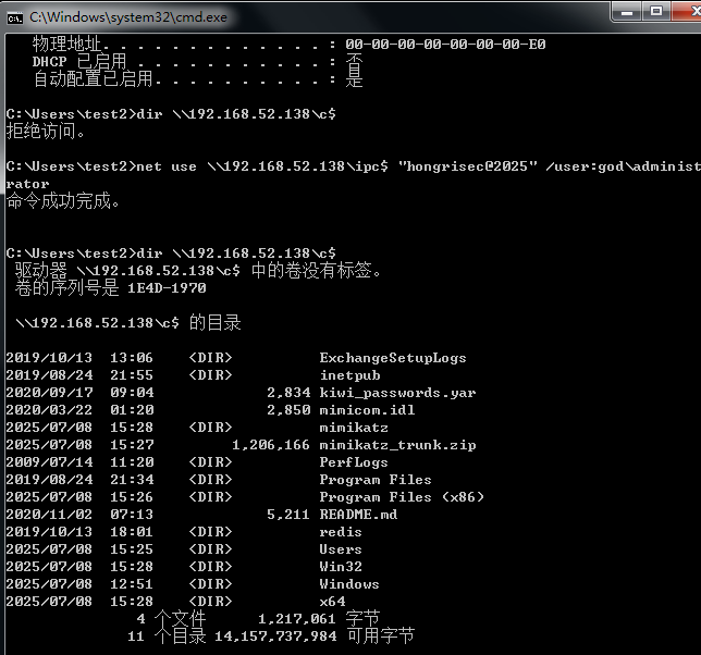 尝试以当前登录用户身份(当前用户身份是192.168.52.143–win7机器下的test2用户)列出域控制器 C 盘共享目录中的文件