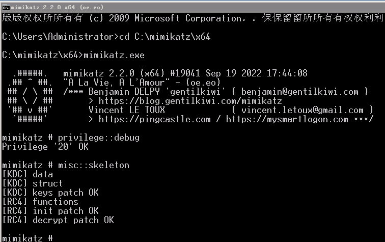 之后在域控制器中以管理员权限打开 mimikatz,输入命令将 Skeleton Key 注入域控制器的 lsass.exe 进程: