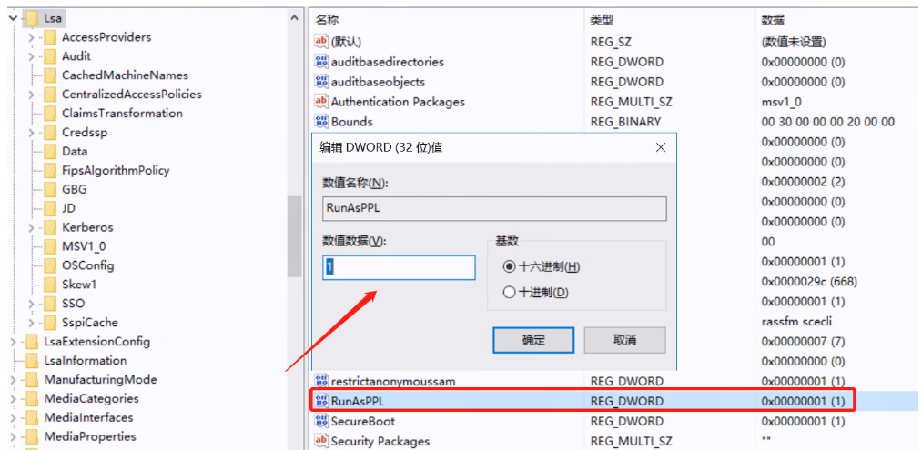 (1)检测注册表位置:HKEY_LOCAL_MACHINE\SYSTEM\CurrentControlSet\Control\Lsa ,是否开启PPL保护。