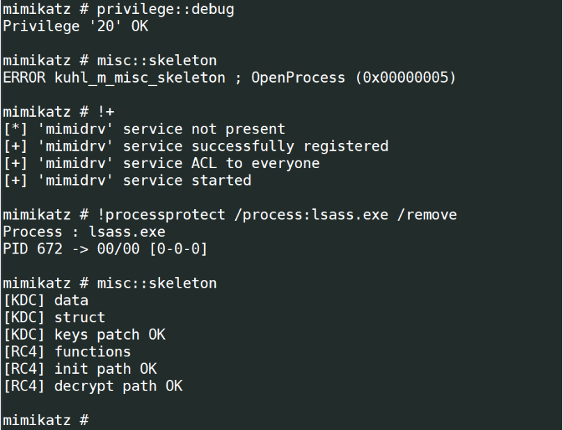 SkeletonKey是一种能在不重启域控制器的情况下,使所有域用户使用统一密码登录的技术。通过将SkeletonKey注入lsass进程,即使在LSA保护开启的情况下,也能通过加载特定驱动绕过限制。