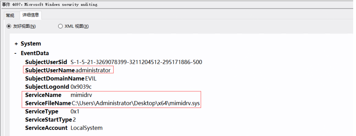 (2)当攻击者尝试加载mimidrv.sys驱动时,将会生成4697事件,这个行为可作为安全日志中最为明显的特征进行识别检测。