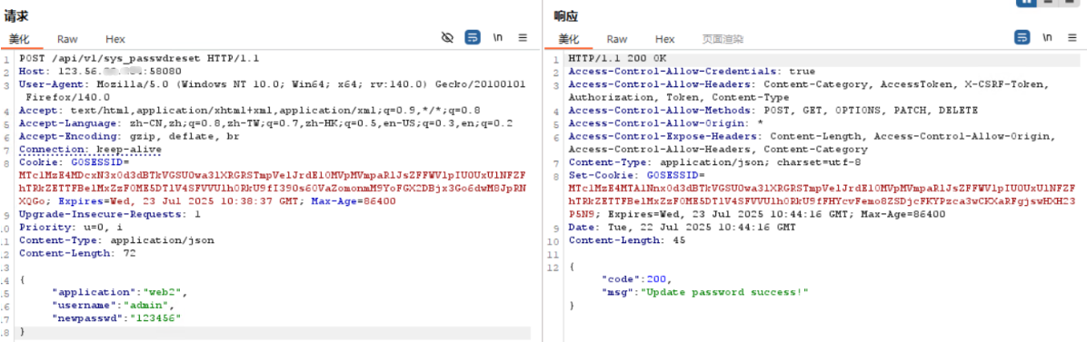 if($action==='login' && $_POST['username'] && $_POST['password']){ $username = $_POST['username']; $password = $_POST['password']; if(Login($loginapi,$username, $password)!==null){ echo 'success';// }else{ echo 'fail'; } } elseif($action==='changepass' && isset($_SESSION['auth'])){ if(isset($_POST['username']) && isset($_POST['oldpassword']) && isset($_POST['newpassword'])){ $username = $_POST['username']; $oldpassword = $_POST['oldpassword']; $newpassword = $_POST['newpassword']; echo ChangePass($loginapi,$resetapi, $username, $oldpassword, $newpassword); } }else{ header(500); die(); }
