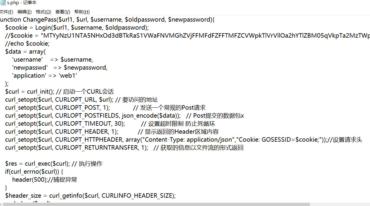 function ChangePass($url1, $url, $username, $oldpassword, $newpassword){ $cookie = Login($url1, $username, $oldpassword); //$cookie = "MTYyNzU1NTA5NHxOd3dBTkRaS1VWaFNVMGhZVjFFMFdFZFFTMFZCVWpkTlVrVllOa2hYTlZBM05qVkpTa2MzTWpOT1ZETkNOakpKUWxoU1JrRkRVa0U9fLekjnGbigV2zA4BL9IPyp7Q6lzJ53hzvmB2TnIyBsXp"; //echo $cookie; $data = array( 'username' => $username, 'newpasswd' => $newpassword, 'application' => 'web1' ); $curl = curl_init(); // 启动一个CURL会话 curl_setopt($curl, CURLOPT_URL, $url); // 要访问的地址 curl_setopt($curl, CURLOPT_POST, 1); // 发送一个常规的Post请求 curl_setopt($curl, CURLOPT_POSTFIELDS, json_encode($data)); // Post提交的数据包x curl_setopt($curl, CURLOPT_TIMEOUT, 30); // 设置超时限制 防止死循环 curl_setopt($curl, CURLOPT_HEADER, 1); // 显示返回的Header区域内容 curl_setopt($curl, CURLOPT_HTTPHEADER, array("Content-Type: application/json","Cookie: GOSESSID=$cookie;"));//设置请求头 curl_setopt($curl, CURLOPT_RETURNTRANSFER, 1); // 获取的信息以文件流的形式返回